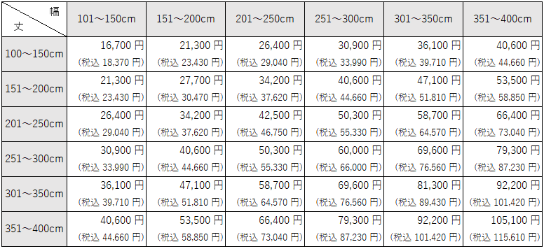 大型窓用ブラインドには最大面積の設定があります。以下の数値以上には価格表に価格の明記があっても製作できません。ご注意くださいませ。