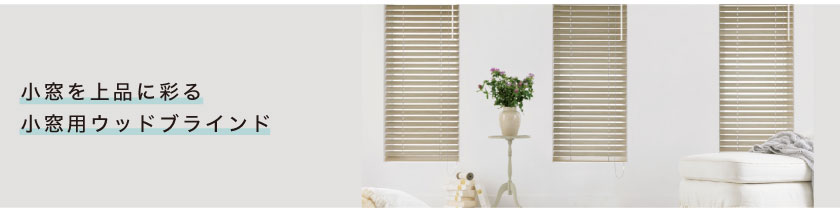 幅230mmから製作可能。細長いスリット窓や、小窓用に設計されたウッドブラインドです。通常窓用のウッドブラインドに比べ、コンパクトなヘッドボックスで、メカが目立つことなく、違和感なくキレイに、スッキリとおさまるのが特徴です。